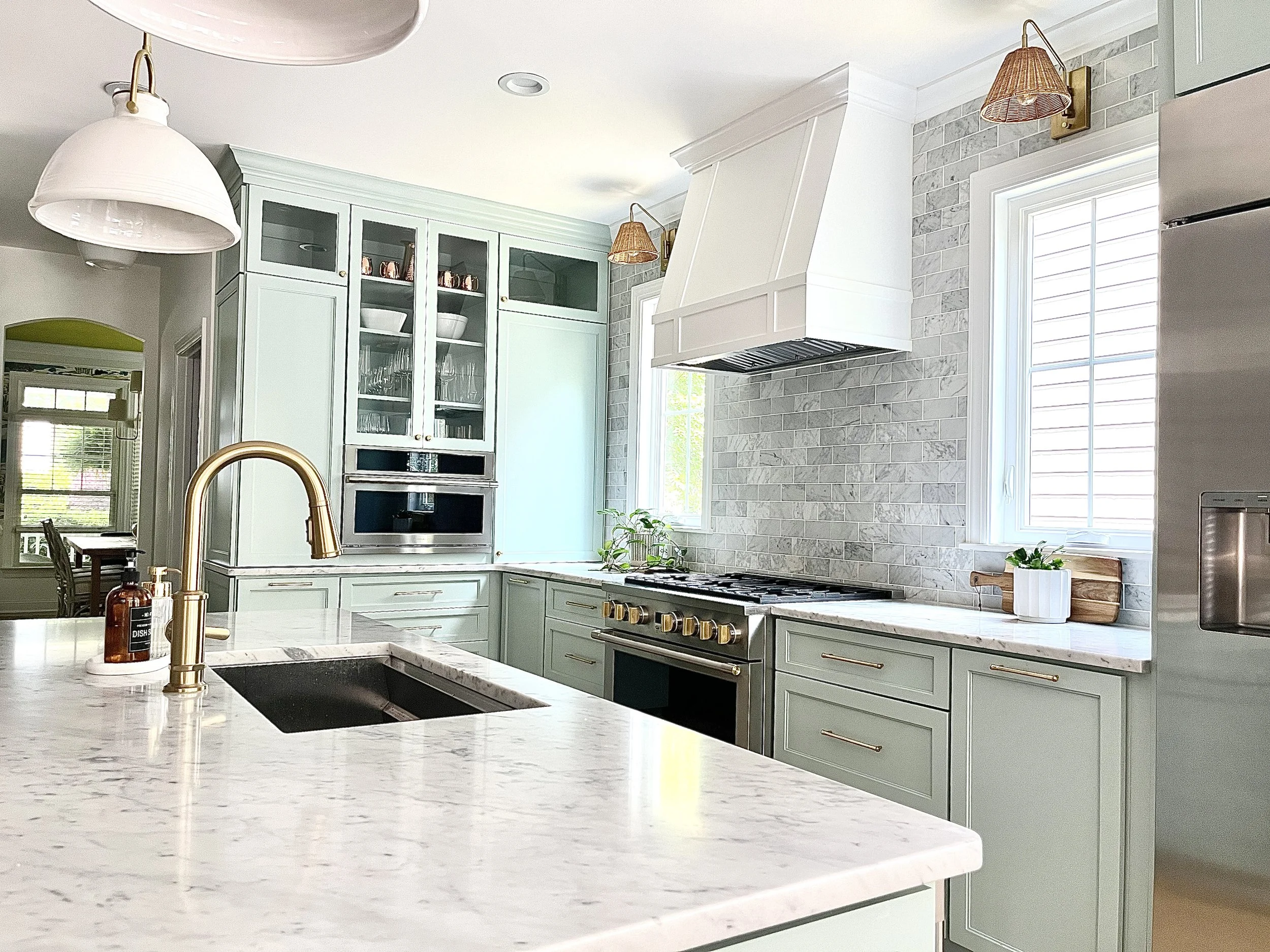 This kitchen involved a completely new layout. The new setup allowed for a larger range, more natural light, and a built-in refrigerator. As for aesthetics we went with a beautiful bright marble on the counters and backsplash and a soft green cabinet color.