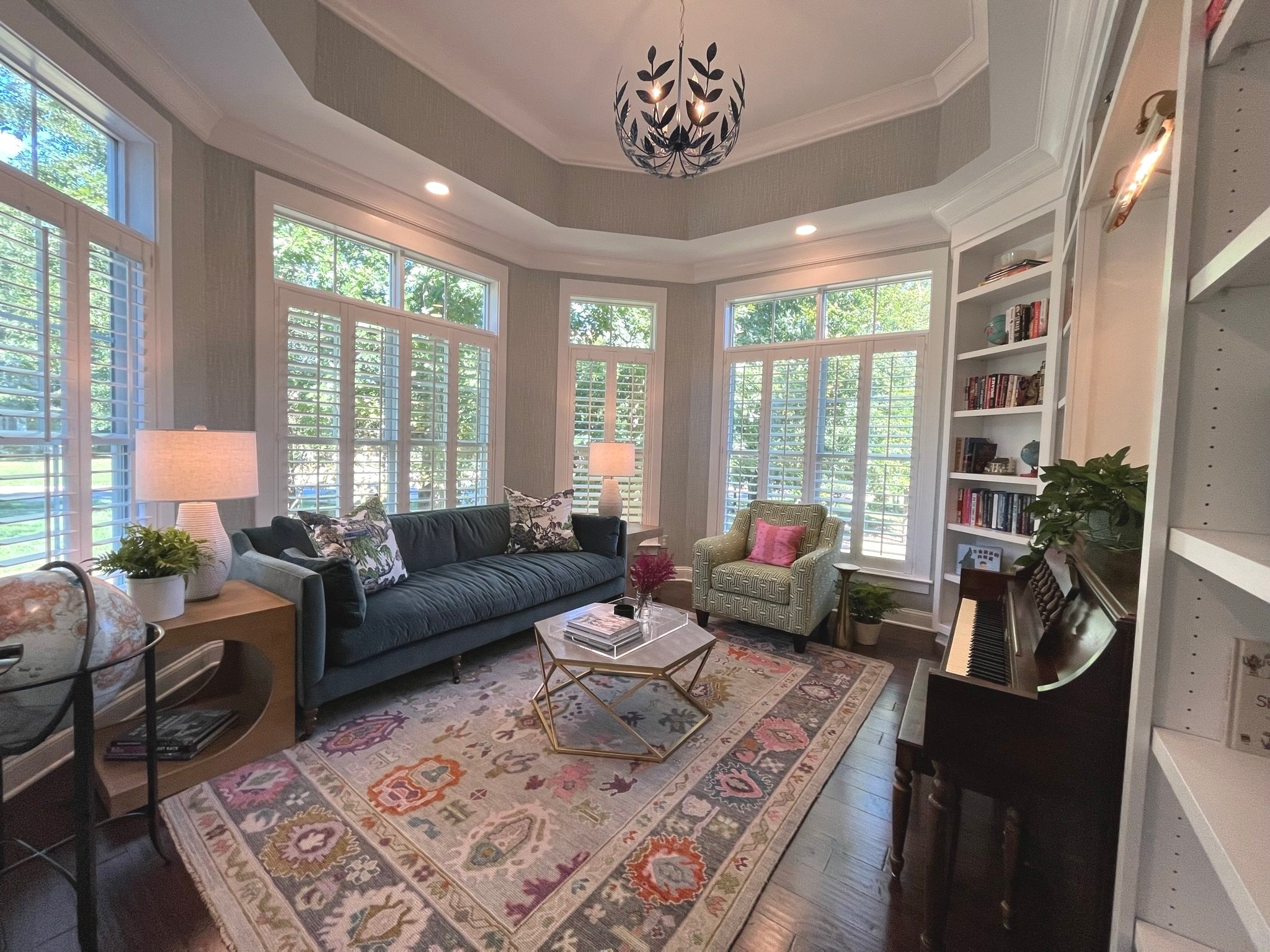 This room is located at the very front of this client’s home and she wanted to create a space that looked pretty as you entered the front door, but also had a purpose. We created a design that highlighted the well-loved family piano and built-in shelving for much of her book collection. The colors and textures in the rug, wallpaper and upholstery all work together to create a comfortable, colorful room which has now become the family’s favorite spot.